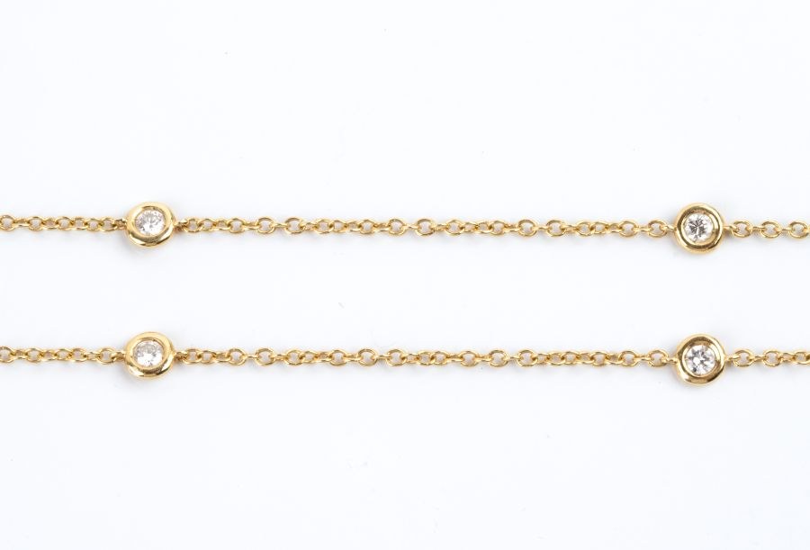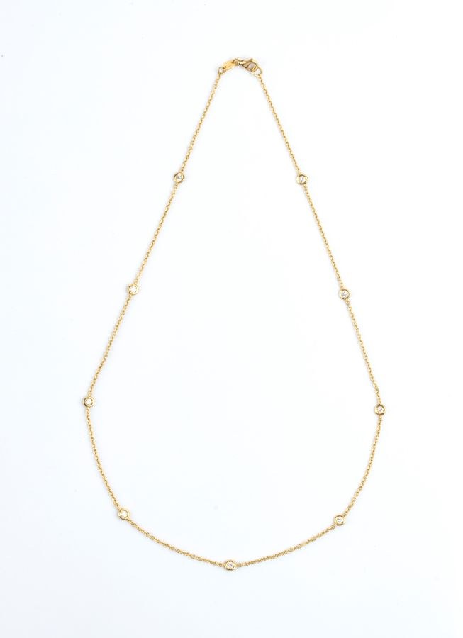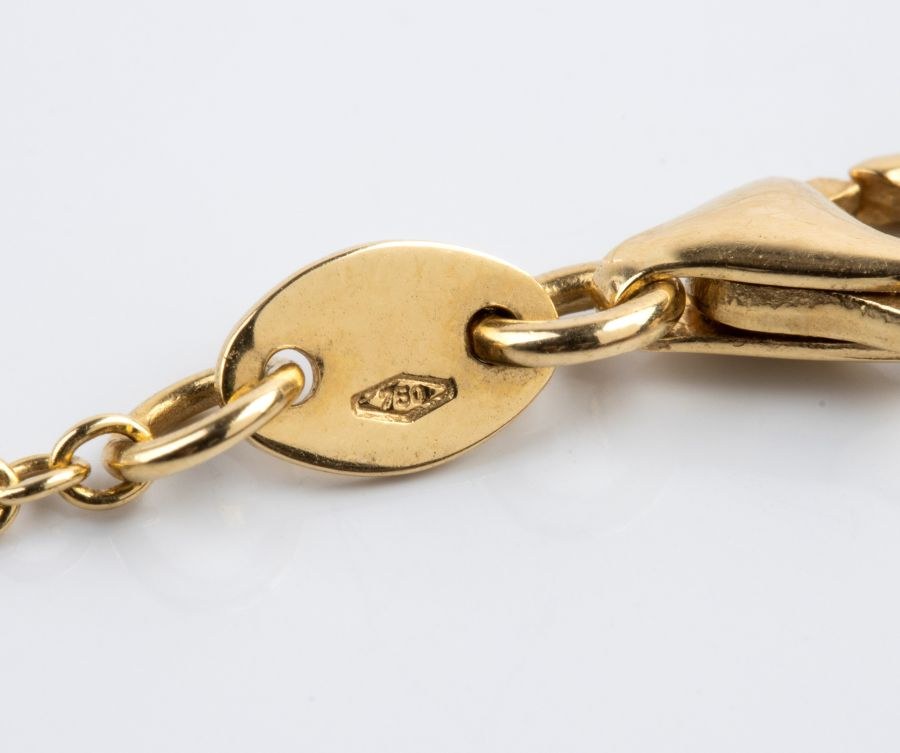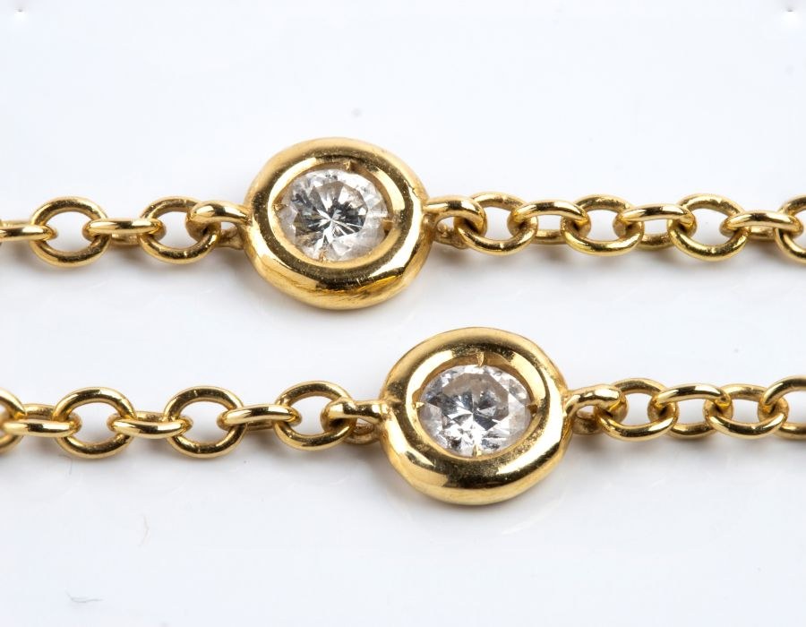 18k yellow gold roll chain, set with 09 round brilliant-cut diamonds, approx. 0.45 ct, G-H, VS-SI.Hallmarked “750”.Chain length: 45 cm. Weight: 4 g. Item condition grading: **** good.The lot is in a good state of preservation with normal signs of use over time.