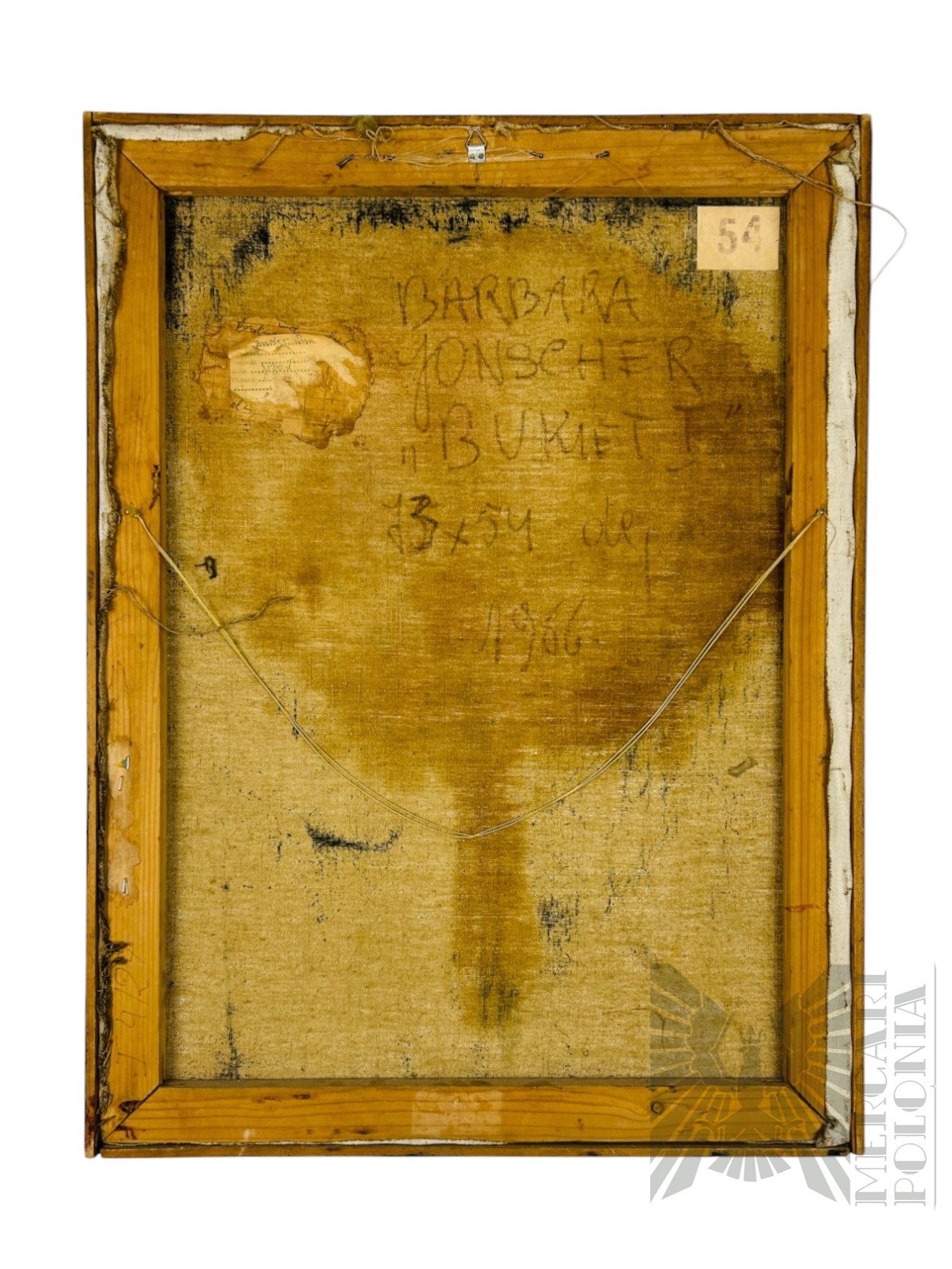 Barbara Jonscher (16 IV 1926 w Bydgoszczy - 21 X 1986 w Warszawie) - polska malarka. Absolwentka gdańskiej i warszawskiej ASP, uczestniczka Ogólnopolskiej Wystawie Młodej Plastyki "Przeciw wojnie, przeciw faszyzmowi" w warszawskim Arsenale (1955), gdzie została laureatką nagrody za malarstwo i rysunek. W 1981 r. uhonorowana nagrodą im. Janusza Cybisa. Członkini wolnomyślicielskiego Klubu Krzywego Koła. Jej twórczość krążyła wokół takich tematów jak pejzaż, martwa natura i portret, operując przy tym kontrastem formy i kompozycji. Kameralne, często intymne wręcz krajobrazy cechują żywiołowe pociągnięcia pędzla; jednocześnie barwna jednolitość jej prac to kolory żywe, kontrastowe, podkreślone przez odważne operowanie światłem.Stan jak na zdjęciach.
