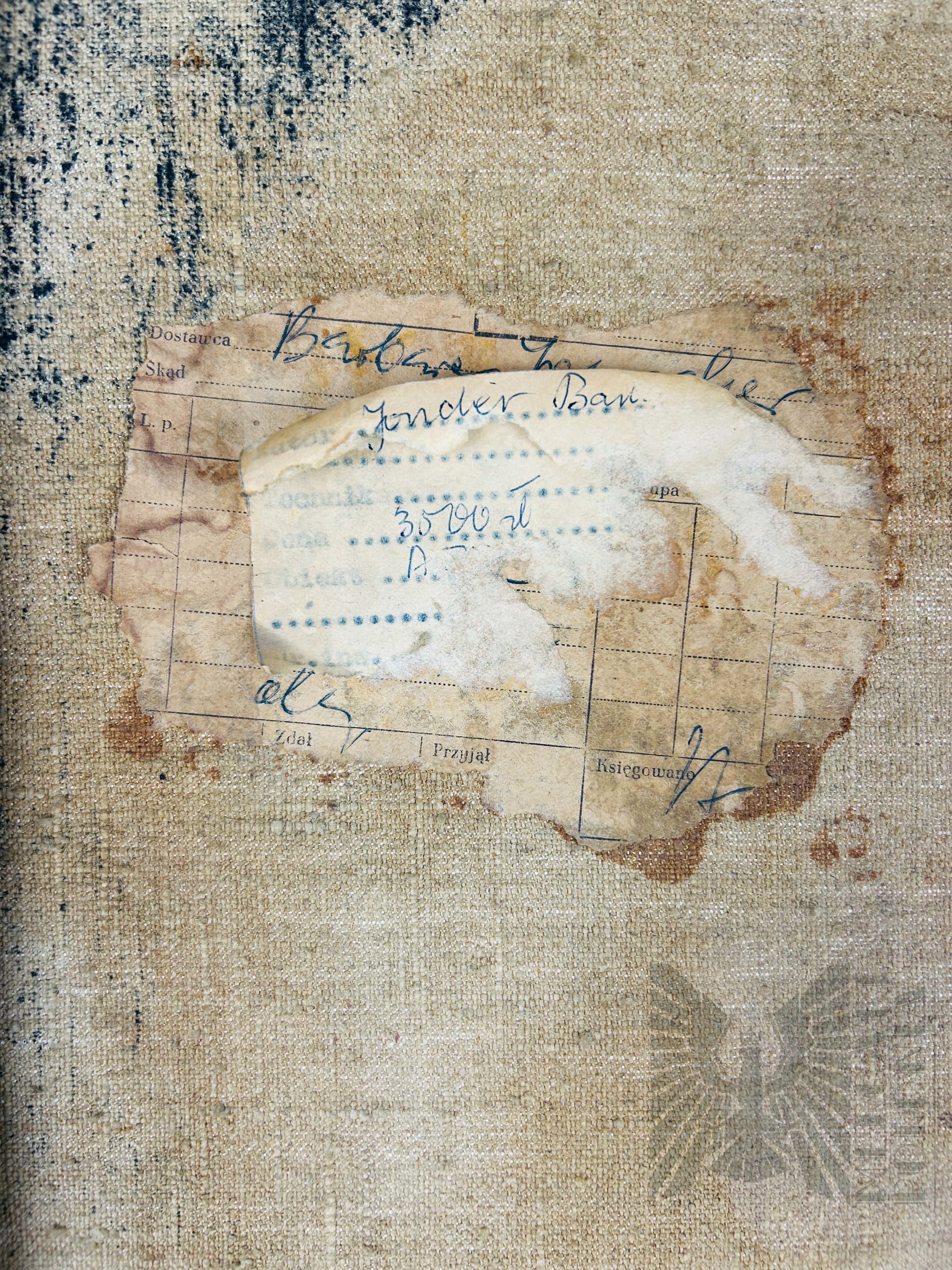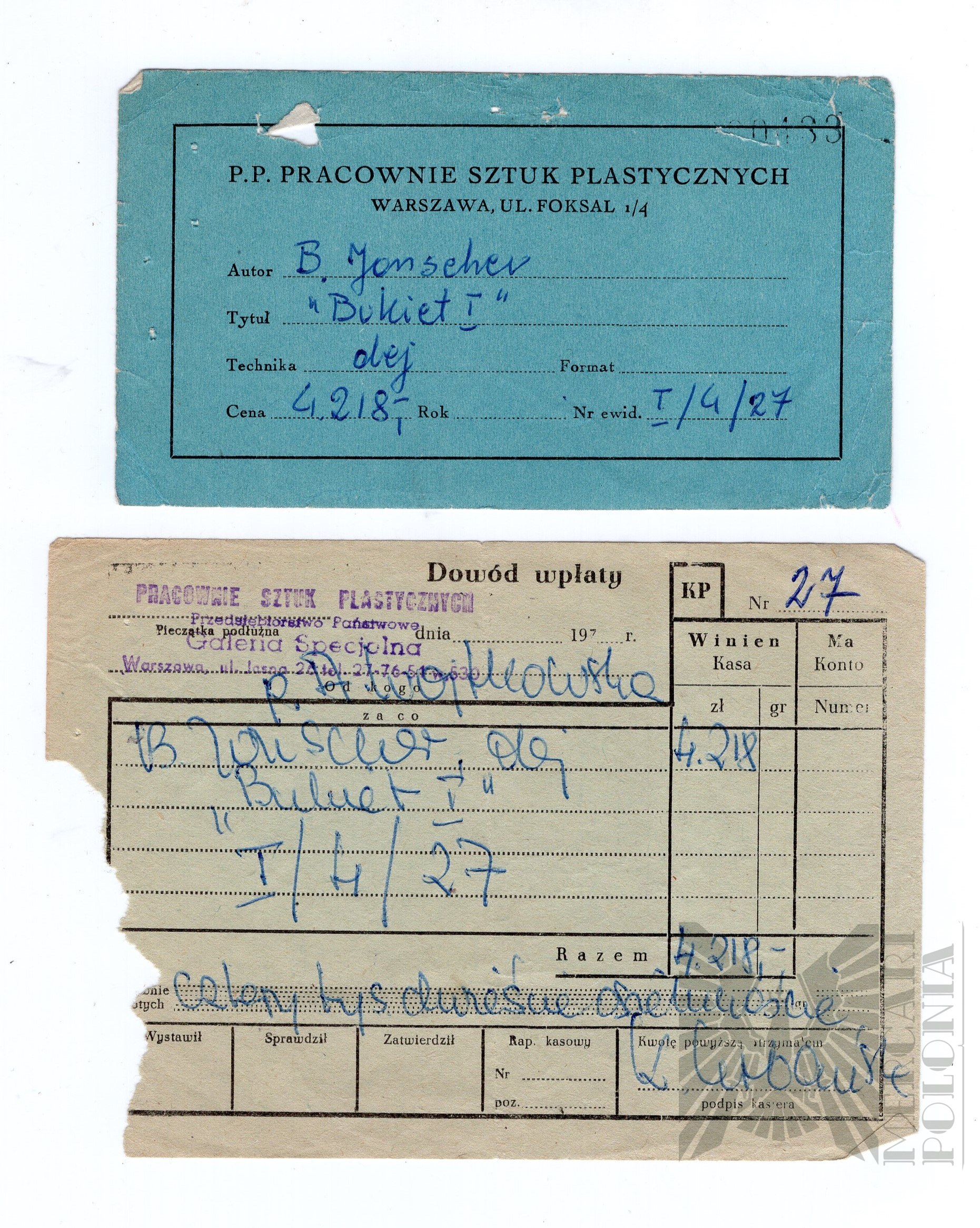 Abstrakcyjna forma bukietu, operująca głównie kontrastową plamą kolorystyczną i grubym, fakturowanym nałożeniem farby. W tym ujęciu kompozycja bukietu przypomina bardziej drzewo - samoistne, zawieszone w ciemności.Na blejtramę naklejone były dowody wpłaty wydane przez Pracownie Sztuk Plastycznych w Warszawie, potwierdzające autorstwo obrazu.