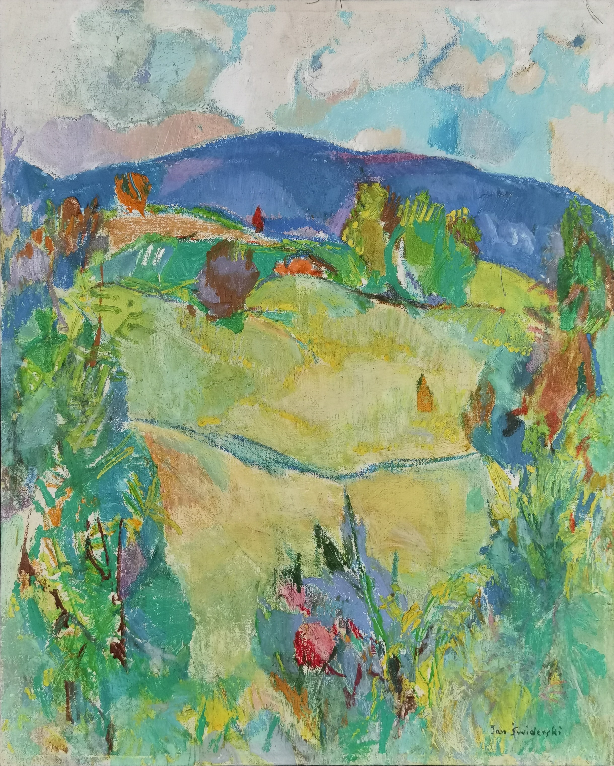 na odwrocie opis autorski: Jan Świderski / "Pejzaż wiosenny" / olej 1989.