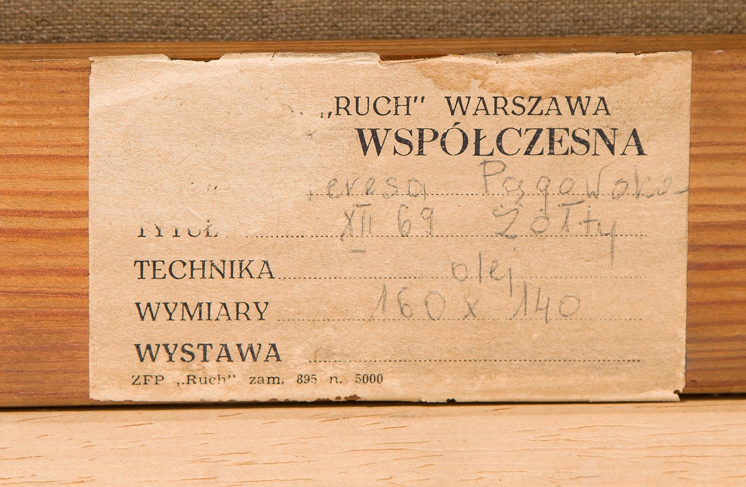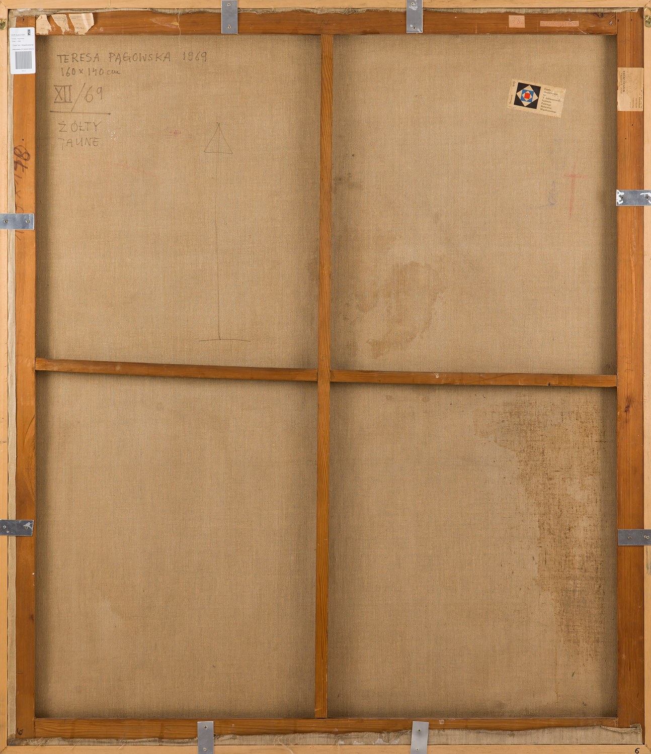 sygnowany, datowany i opisany na odwrociu: 'TERESA PĄGOWSKA 1969 | 160 x 140 cm | XII/69 | ŻÓŁTY | JAUNE' oraz wskazówka montażowa