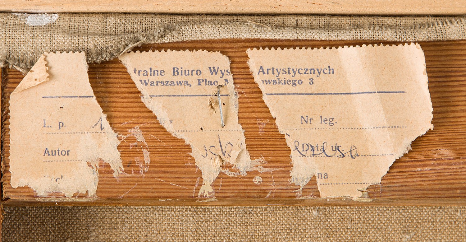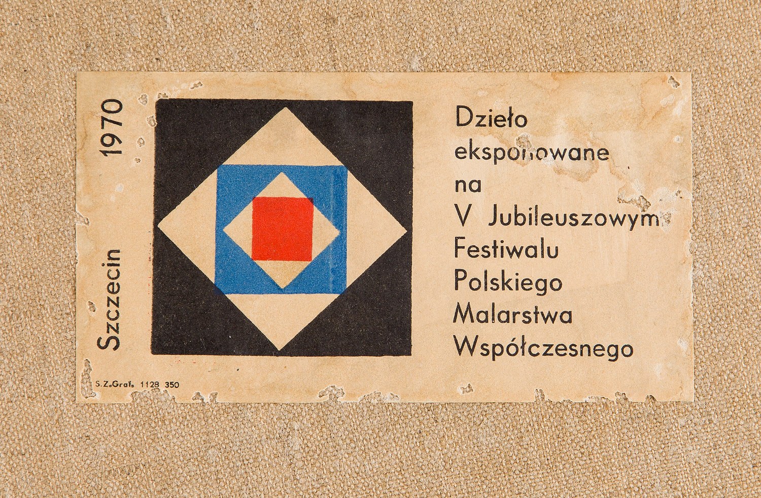 na odwrociu nalepka V Jubileuszowego Festiwalu Malarstwa Współczesnego, nalepka K.M.P.I.K. „RUCH” WARSZAWA, Galeria Współczesna oraz nalepka Centralnego Biura Wystaw Artystycznych „Zachęta”