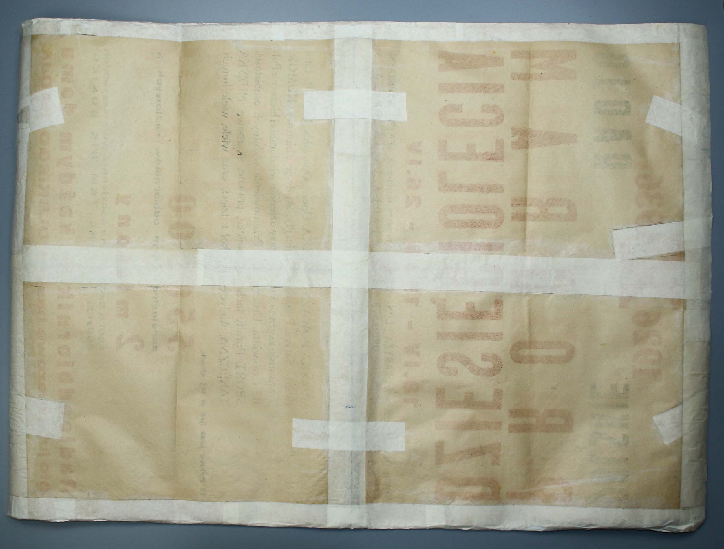 Naderwania marginesów i załamania podklejone paskami papieru.