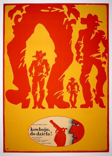 Plakat filmowy 81,5x58 cm. Czerwone sylwetki czterech kowbojów na żółtym tle. Film angielski (oryg. "Carry on, Cowboy"). Reż. G. Thomas. Wyk. S. James, K. Williams. Niewielkie naddarcia krawędzi, rozprasowane poprzeczne załamanie arkusza.