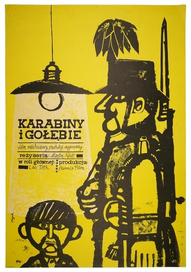Plakat filmowy form. 83,5x58 cm. Węgierski żandarm i mały chłopiec. Młodzieżowy film węgierski (oryg. "Puskak es galambok"). Reż. M. Keleti. Wyst. L. Toth, I. Bucsi. Poprzeczne załamanie arkusza, niewielkie otwory w narożnikach.