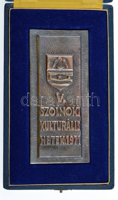 1971. "V. Szolnoki Kulturális Hetek 1971" ezüstözött fém plakett, eredeti dísztokban (132x60mm) T:1...