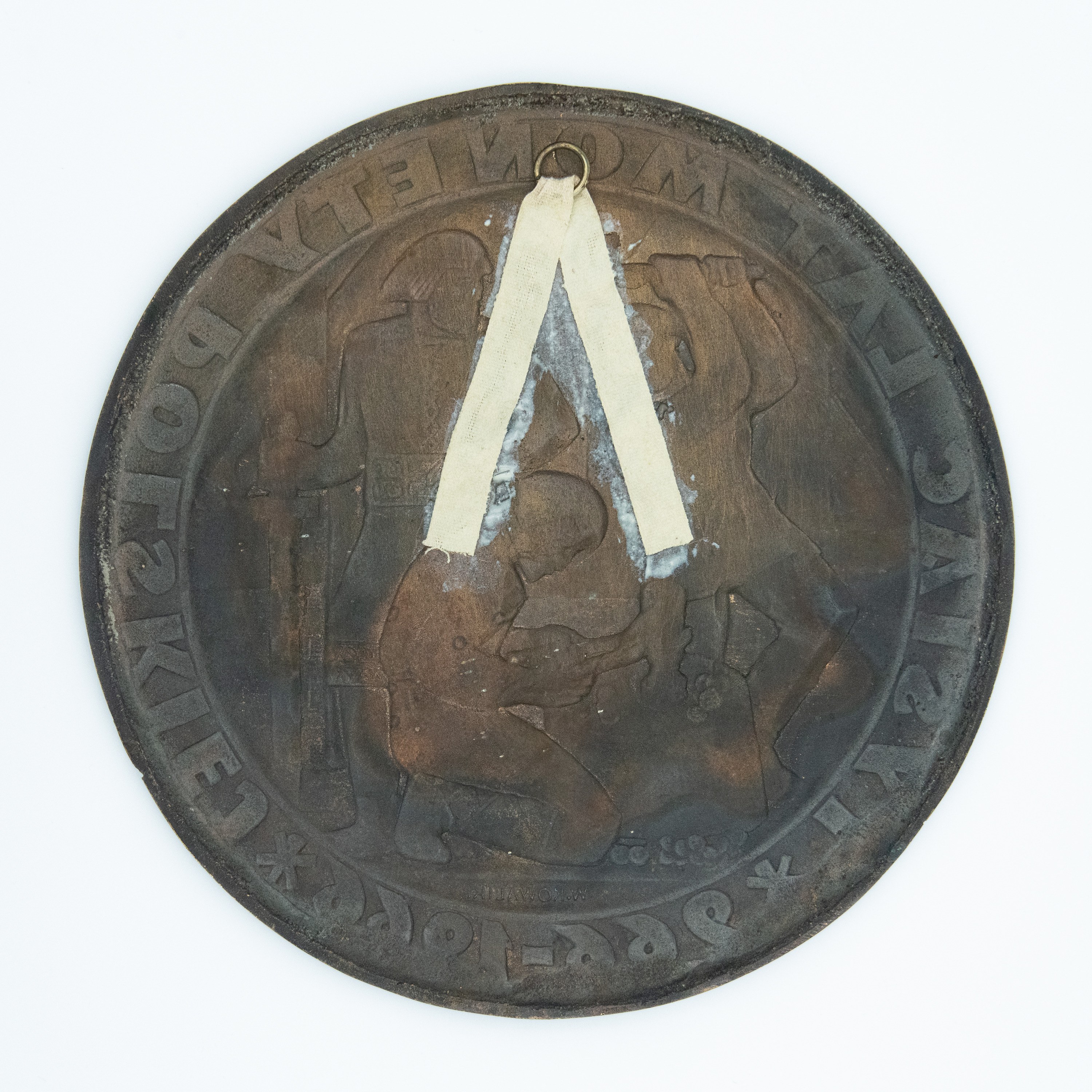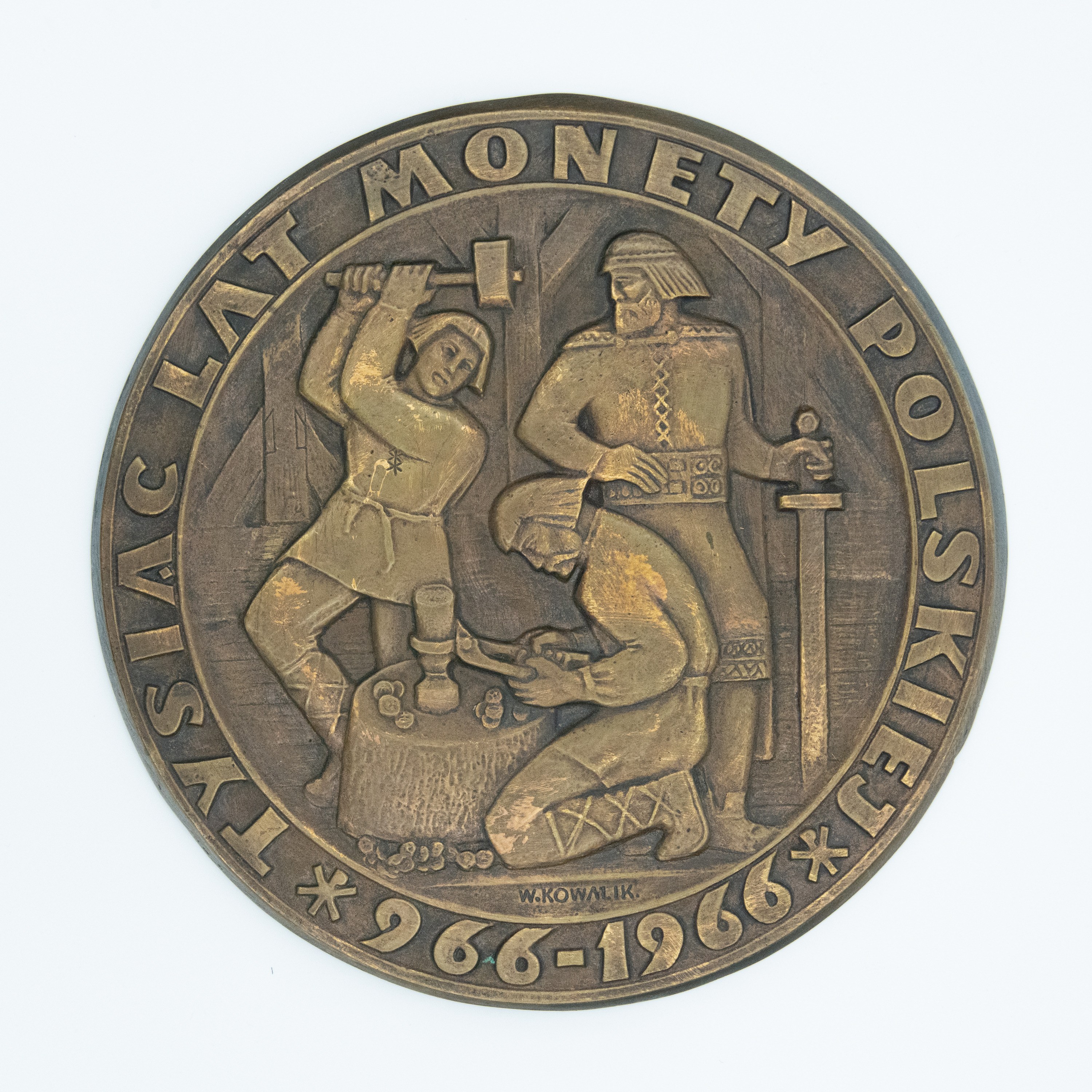 Plakieta pamiątkowa - "TYSIĄC LAT MONETY POLSKIEJ 966-1966", brąz, śr. 23 cm. W środkowej części plakiety przedstawienie wybijania monet. Na otoku napis: "TYSIĄC LAT MONETY POLSKIEJ*966-1966*". Sygnatura ś. d.: "W.KOWALIK." Rewers z mocną kontrą. Wydatna krawędź rewersu. Doklejone koluszko do zawieszenia. Stan dobry.