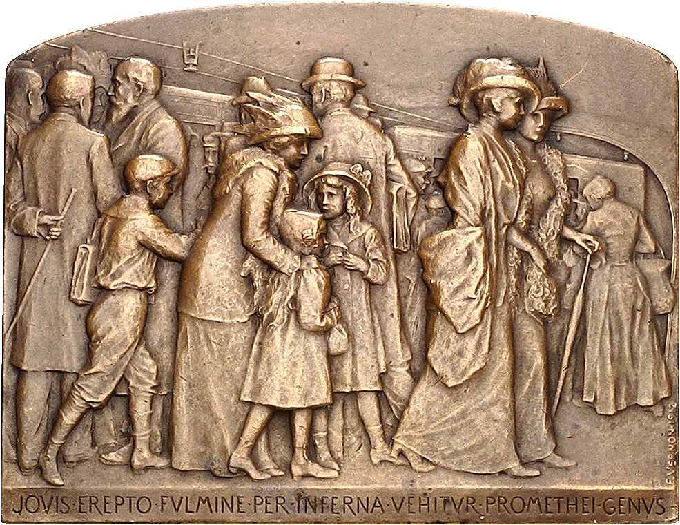 Av. JOVIS. EREPTO. FVLMINE. PER. INFERNA. VEHITVR. PROMETHEI. GENVS. Scène de passagers dans le métropolitain ; signature F. VERNON 1912.