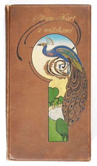 Album z początku XX w. form. 38,5x21,5 cm, k. 51, oprawa oryg. płócienna, na przedniej okł. secesyjna kompozycja z pawiem i złoc. nadrukiem: "Album kart z widokami". Na początku karta z rozbudowaną ozdobną winietą. Każda kolejna karta pozwalała na zamontowanie 5 pocztówek (3 poziomo i 2 pionowo na odwrocie) - wszystkie miejsca zostały wykorzystane. Znaczna większość pocztówek zawiera korespondencję w jęz. polskim, karty w większości są produkcji zagranicznej.