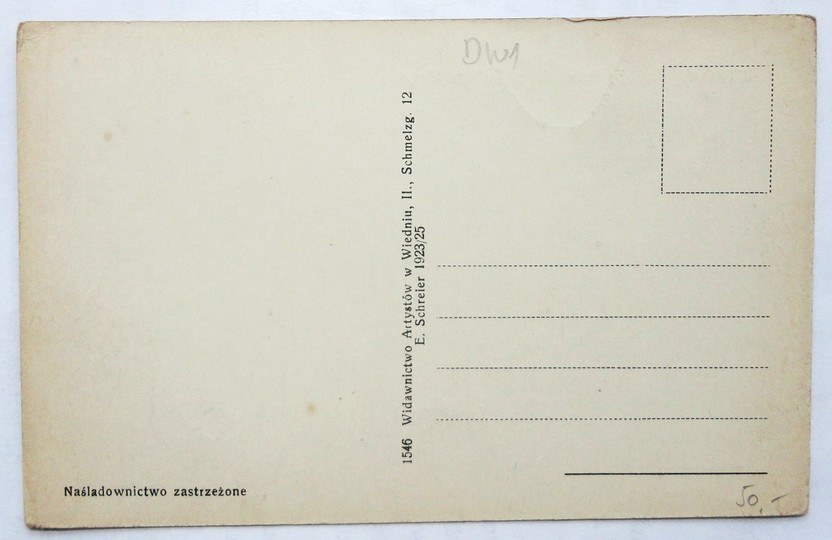 1546. Widawnictwo [!] Artystów w Wiedniu, II., Schmelzg. 12 E. Schreier 1923/25. Bez korespondencji i znaczka. Krawędzie nieco otarte, poza tym stan dobry.