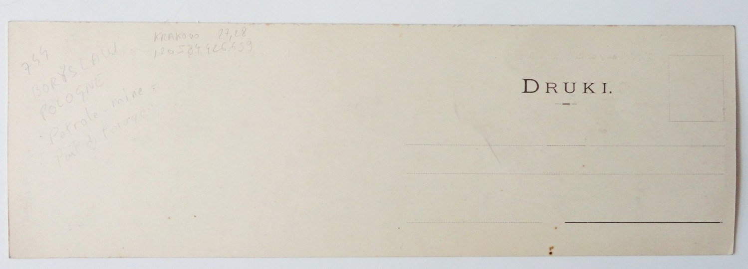 Leon Rosenschein, Drohobycz. 1904. Panoramiczna pocztówka, form. 9x28 cm. Bez korespondencji i znaczka. Na odwrocie napisy identyfikujące ołówkiem. Miejscowe niewielkie zaplamienia, poza tym stan bardzo dobry.