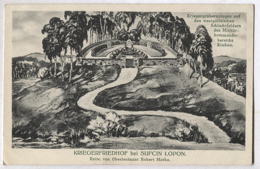 Druck von Ed. Strache, Warnsdorf und Haida i. B. [Czechy]. Serie 1. Westgalizische Friedhöfe. Lata I wojny. Projekt (niezrealizowany) cmentarza wojennego w okolicach wsi Sufczyn i Łopoń pod Tarnowem. Bez korespondencji i znaczka. Stan dobry.