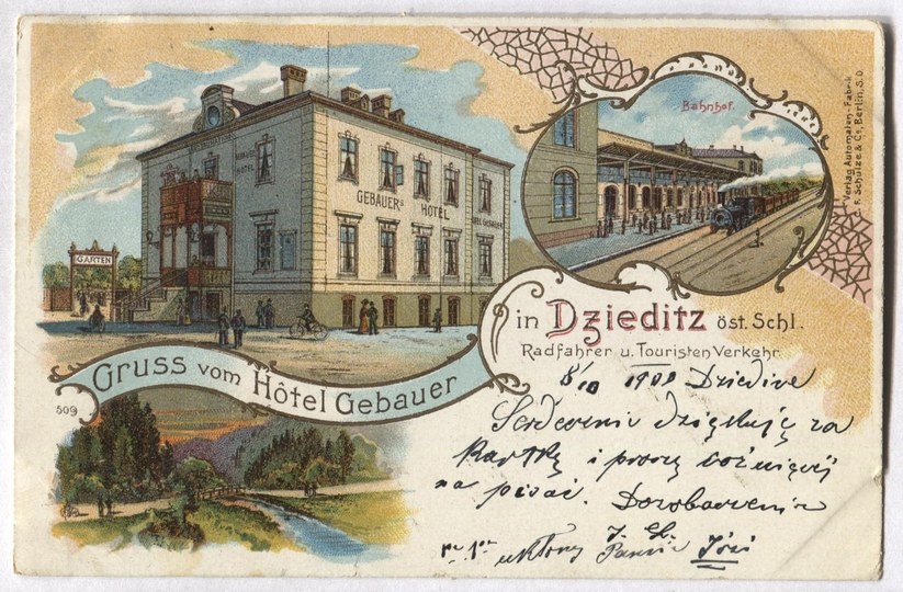 [CZECHOWICE-DZIEDZICE]. Gruss vom Hôtel Gebauer in Dzieditz öst. Schl. Radfahrer u. Touristen Verkehr.