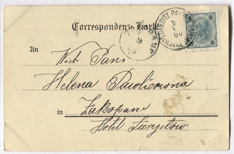 Verlag Automaten-Fabrik C. F. Schülze & C-e, Berlin S.O. Z korespondencją i znaczkiem. Data stempla 8 X 1900. Niewielkie zaplamienie strony adresowej, zagniecenia narożników - efekt przechowywania w albumie.