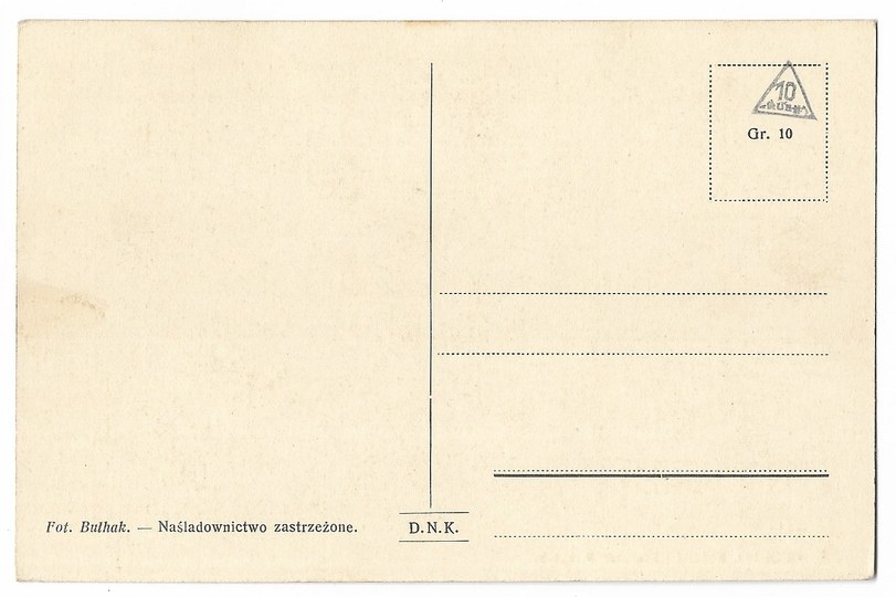 Fot. Bułhak. D.N.K. [= Drukarnia Narodowa, Kraków]. "Ruch". W polu znaczkowym nadruk "Gr. 10". Lata 30. XX w.? Bez korespondencji i znaczka. Stan dobry.