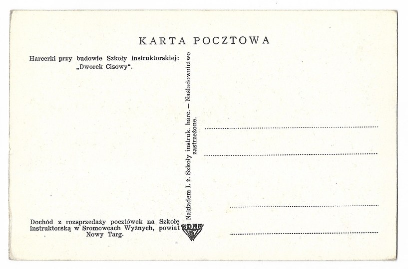 Nakładem I ż. Szkoły instruk. harc. Dochód z rozsprzedaży pocztówek na szkołę instruktorską w Sromowcach Wyżnych, powiat Nowy Targ. Wczesna lata 30. XX w. [Druk] DN [= Drukarnia Narodowa, Kraków]. Bez korespondencji i znaczka. Niewielkie otarcia.