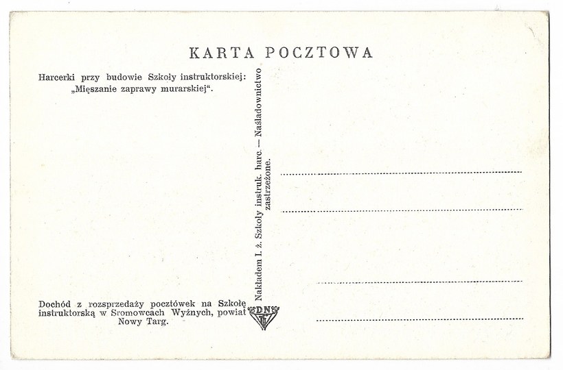 Nakładem I ż. Szkoły instruk. harc. Dochód z rozsprzedaży pocztówek na szkołę instruktorską w Sromowcach Wyżnych, powiat Nowy Targ. Wczesna lata 30. XX w. [Druk] DN [= Drukarnia Narodowa, Kraków]. Bez korespondencji i znaczka. Niewielkie otarcia, nieznaczne załamanie górnego narożnika.