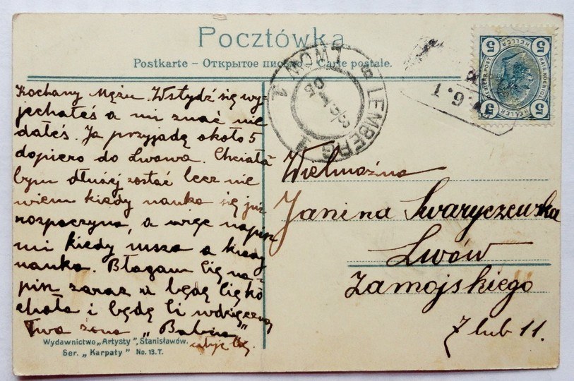 Wydawnictwo "Artysty", Stanisławów. Ser. "Karpaty" No 13.T. Na licu nadruk z datą 1905. Z korespondencją, znaczkiem i dwoma stemplami pocztowymi. Stan dobry.
