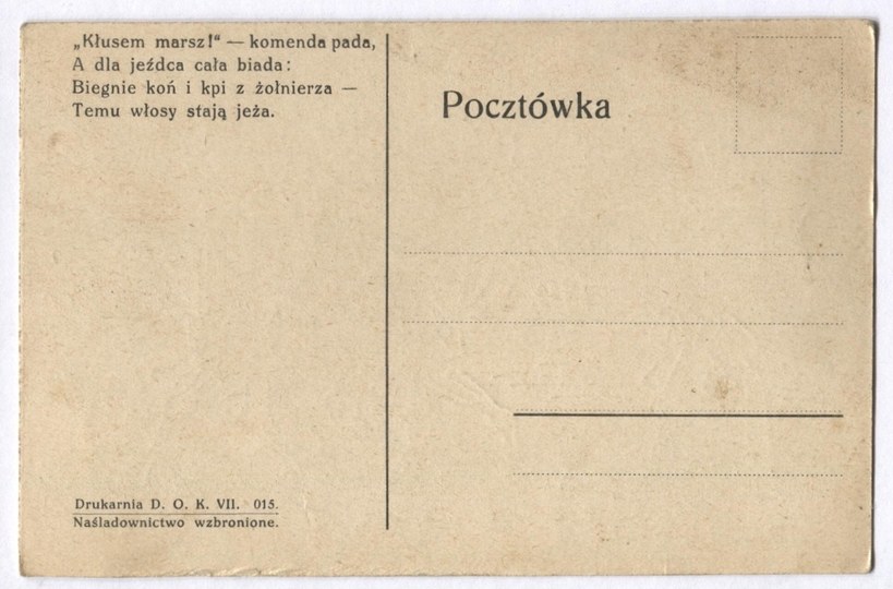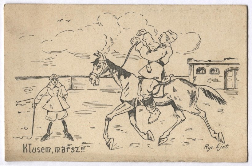Drukarnia D.O.K. VII. 015. Lata 20. XX w.? Satyryczna kompozycja podpisana "Rys. Ejot". Na odwrocie czterowiersz: "'Kłusem marsz!' - komenda pada, / A dla jeźdźca cała biada: / Biegnie koń i kpi z żołnierza = / Temu włosy stają jeża.". Bez korespondencji. Nieznaczne zaplamienia.
