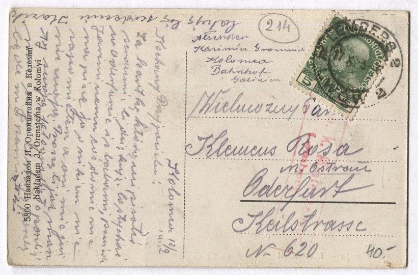5800 Nakladom Ja. Orenštajna v Kolomyi [cyrylicą]. Nakładem j. Orensteina w Kołomyi. Z korespondencja i znaczkiem. Data listu: 12 IX 1915. Zabrudzenia tuszem narożnika strony widokowej.