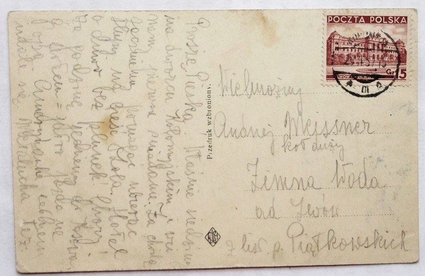 Na odwrocie dane wydawcy - RJCH [?]. Z korespondencją, znaczkiem i stemplem pocztowym z niezbyt czytelną datą z 1937. Miejscowe zaplamienia, stan ogólny dobry.