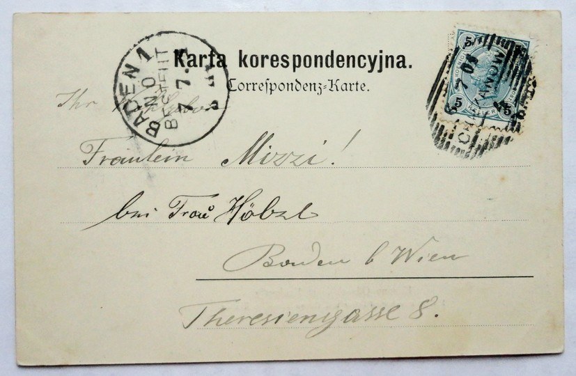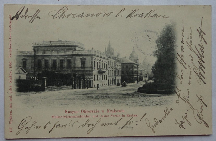 113 Wydawn. sal. mal. polsk. Kraków. 1900. Pocztówka z długą linią adresową. Z korespondencją, znaczkiem i dwoma stemplami pocztowymi. Stan dobry.
