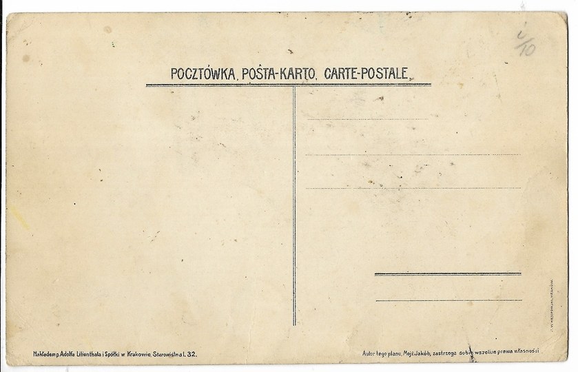 Nakłądem p. Adolfa Lilienthala i Spółki w Krakowie, Starowiślna l. 32. Autor tego planu Moj. Jakób, zastrzega sobie wszelkie prawa własności. [Druk.] W. Krzepowski, Kraków. Pocztówka sprzed I wojny. Przy poszczególnych dzielnicach podano strukturę wyznaniową mieszkańców. Otarcia, zabrudzenia arkusza na odwrocie.