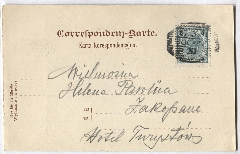Druck von Edgar Schmidt. Dresden-Budapest. Zabudowania klasztoru na Bielanach. Z korespondencją i znaczkiem. Stempel z 1901 (?). Stan dobry.