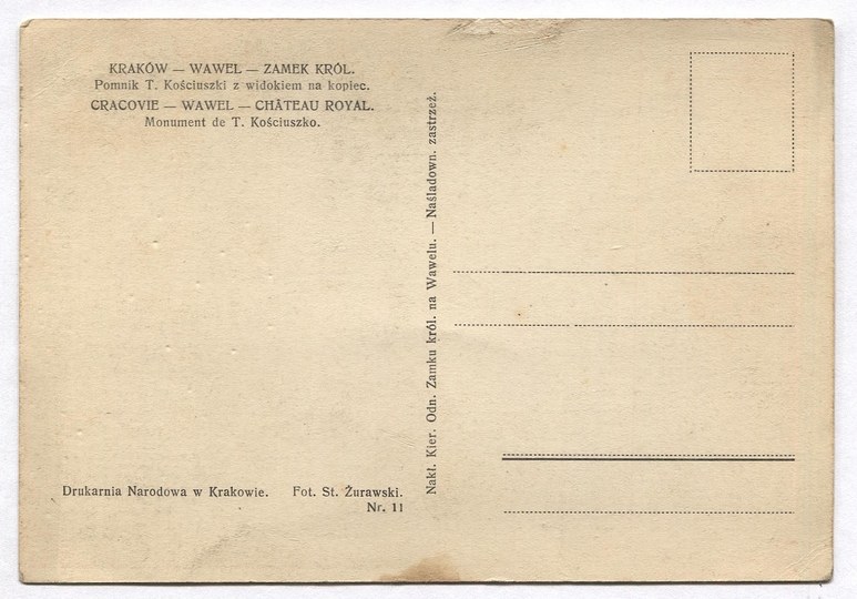 Nakł. Kier. Odn. Zamku król. na Wawelu. Drukarnia Narodowa w Krakowie. Fot. St. Żurawki. Nr 11. Lata 30.? Bez korespondencji i znaczka. Niewielkie zaplamienie na odwrocie.