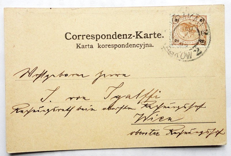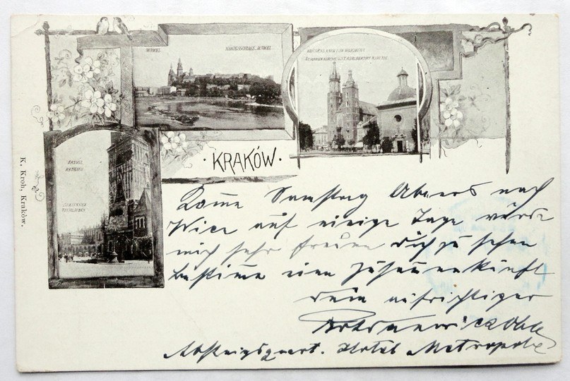 K. Kroh, Kraków. Pocztówka z długą linią adresową. Z korespondencją, znaczkiem i dwoma stemplami pocztowymi. Stan bardzo dobry.