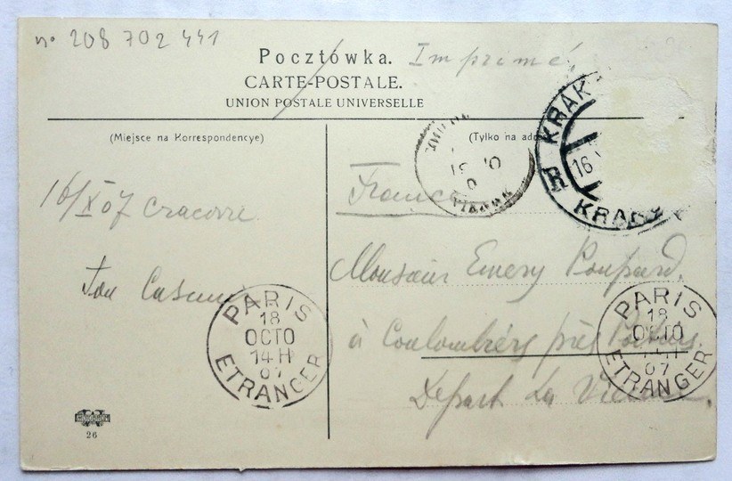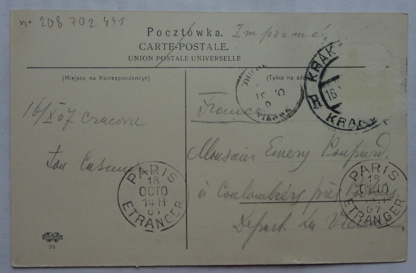 [Wyd.] ---rotobrom ? 26. Z korespondencją dat.: "16/X 07", trzema stemplami pocztowymi, znaczek usunięty. Stan bardzo dobry.