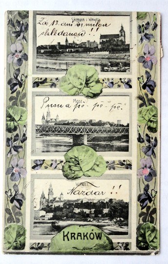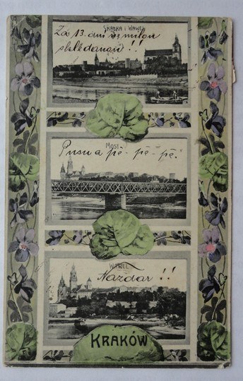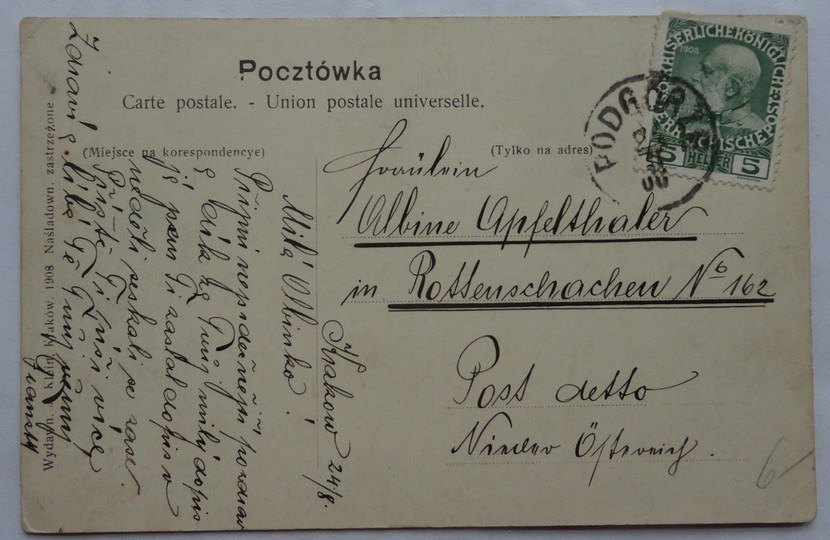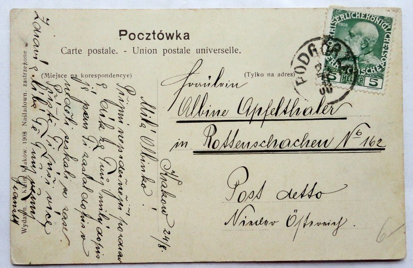 Wydawn. J. Klein, Kraków 1908. Z korespondencją, znaczkiem i stemplem pocztowym. Krawędzie lekko otarte, nieznaczne załamanie lewego górnego narożnika, poza tym stan dobry.