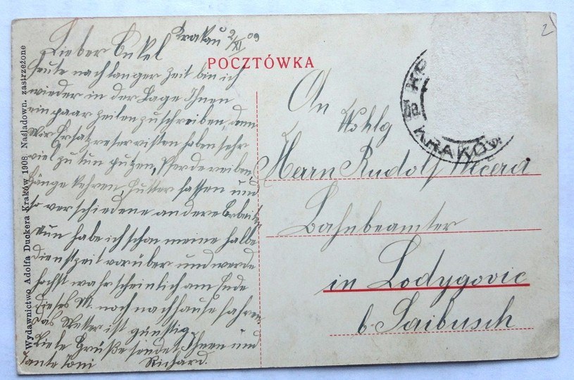 Wydawnictwo Adolfa Duckera Kraków 1908. Z korespondencją dat.: "2/XI 09" i stemplem pocztowym z 1913, znaczek usunięty. Krawędzie lekko otarte, poza tym stan dobry.