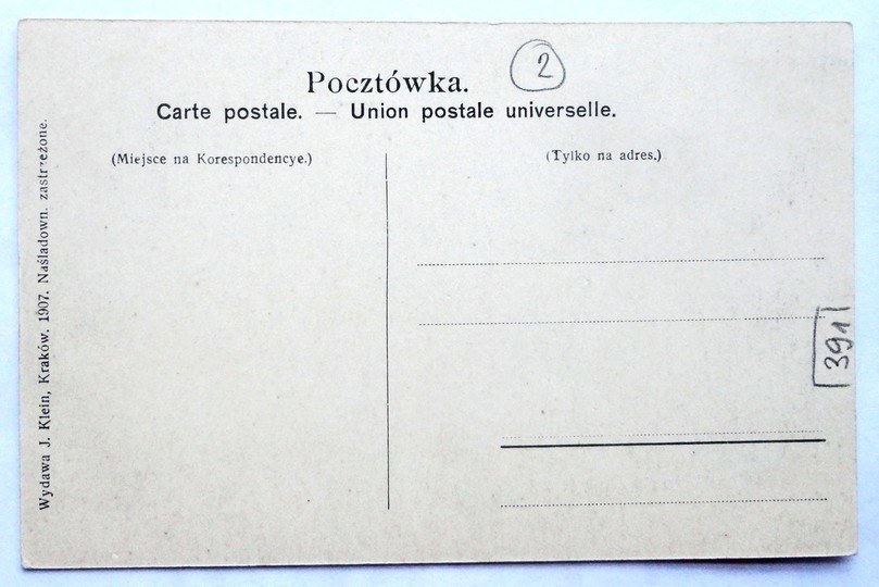 Wydawa [!] J. Klein, Kraków. 1907. Bez korespondencji i znaczka. Stan bardzo dobry.