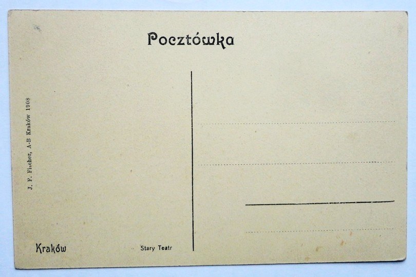 [Wyd.]. J. F. Fischer, A-B Kraków 1908. Bez korespondencji i znaczka. Stan bardzo dobry.