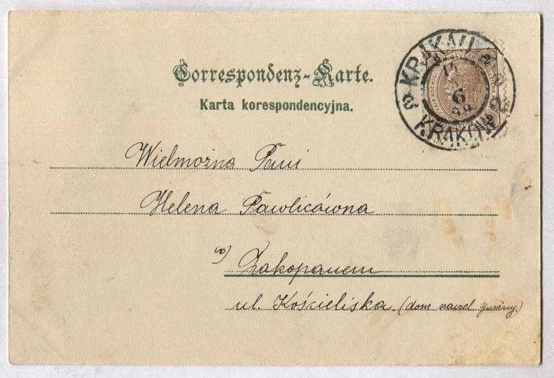 Wydawn. sal. mal. polsk. Kraków. Z korespondencją i znaczkiem. Data listu: 14 V 1899. Nieznaczne zaplamienie strony widokowej, niewielkie zagięcia narożników - efekt przechowywania w albumie.
