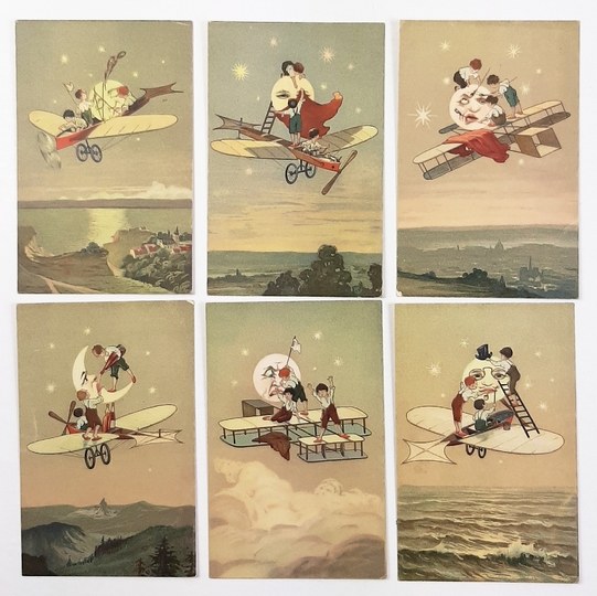 BD N-o 425. Troje dzieci w aeroplanie czyszczące tarczę Księżyca. Pocztówki z 1911. Niewielkie otarcia, stan dobry.