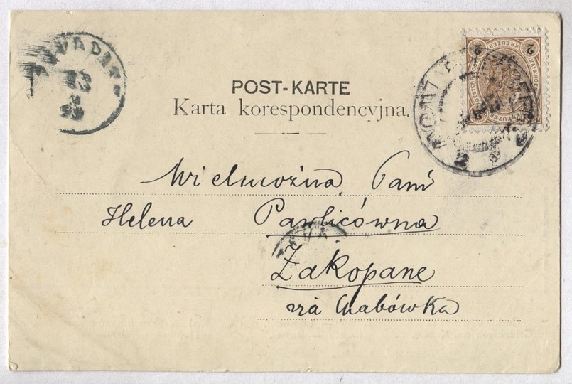 [Kunstanstalt Stephan Tietze, Aussig]. Nazwa wydawcy i niemieckie nazwy obiektów przedstawionych na pocztówce zakreslone atramentem. Z korespondencją i znaczkiem. Zabrudzenia tuszem strony widokowej, niewielkie zagięcia narożników - efekt przechowywania pocztówki w albumie.