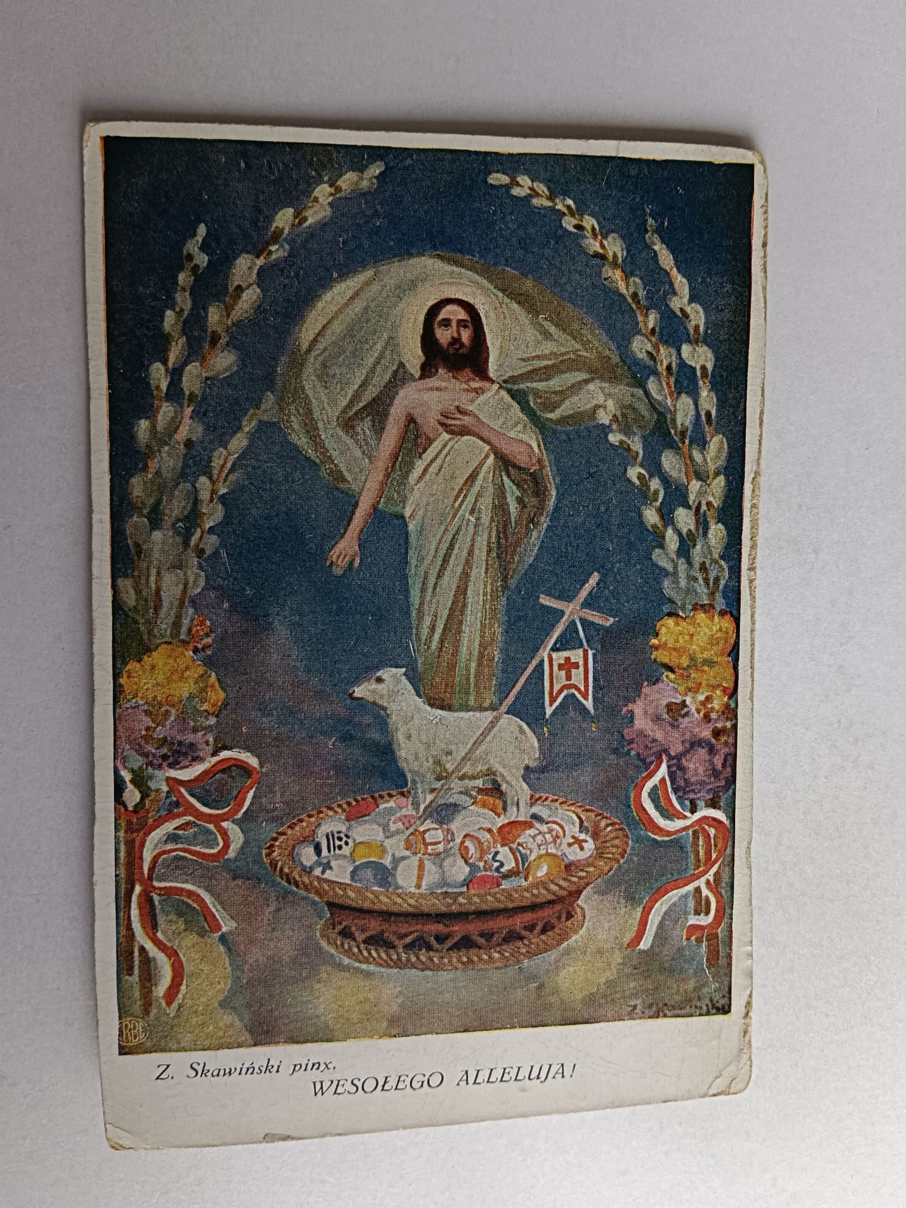 MALARSTWO POLSKIE SKAWIŃSKI, WIELKANOC, JEZUS, BARANEK, KOSZYK, PISANKI, STEMPEL, ZNACZEK