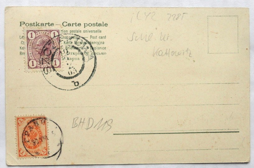 Z dwoma znaczkami i stemplem pocztowym ze Szczakowej. 1907? Prawe narożniki nieznacznie załamane, poza tym stan dobry.