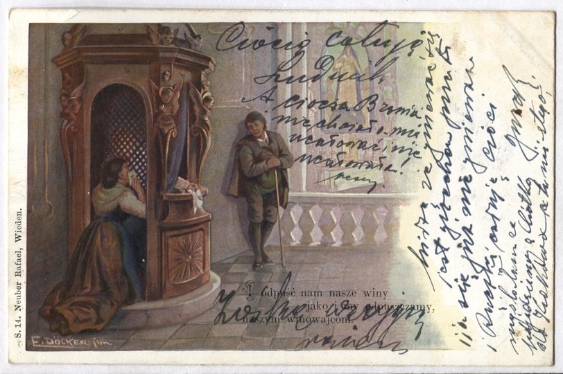 S. 14. Neuber Rafael Wieden. Ilustracja ukazująca spowiedź w konfesjonale. Kompozycja sygn. "E. Döcker jun.". Z korespondencją i znaczkiem. Data stempla: 13 VII 1901. Drobne zaplamienia, niewielkie zagięcia narożników - efekt przechowywania pocztówki w albumie.