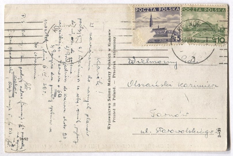 Wydawnictwo Salonu Malarzy Polskich w Krakowie. 76/92. Reprodukcja obrazu Jerzego Kossaka. Z korespondencją i dwoma znaczkami (jeden uszkodzony). Data stempla 3 IV 1939. Pocztówka kierowana do młodego wówczas Kazimierza Olszańskiego w Tarnowie, późniejszego autora monografii Kossaków. Załamanie narożnika.