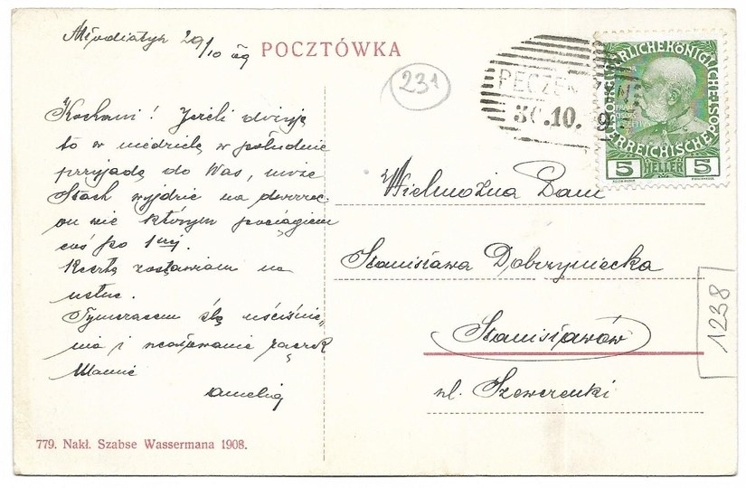 779. Nakł. Szabse Wassermana 1908. Z korespondencją, znaczkiem i stemplem pocztowym. Niewielkie miejscowe zaplamienia, poza tym stan dobry.