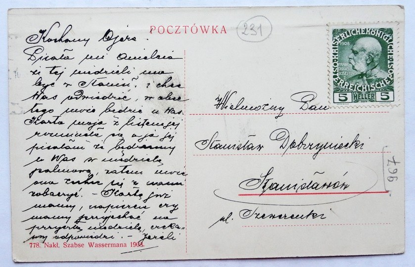778. Nakł. Szabse Wassermana 1908. Z korespondencją, znaczkiem pocztowym. Niewielkie miejscowe zaplamienia, poza tym stan dobry.