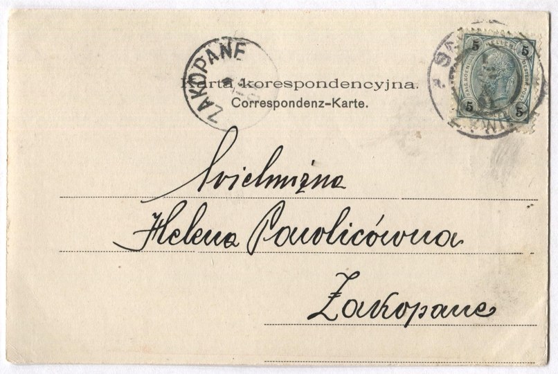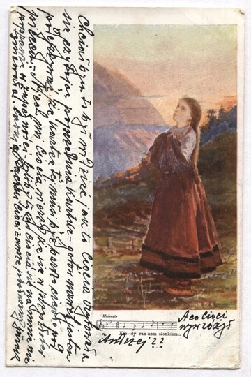 Bez danych wydawniczych. Reprodukcja obrazu nieznanego autorstwa. Z korespondencją i znaczkiem. Stempel z 1901. Otarcia, niewielkie zagięcia narożników; efekt przechowywania pocztówki w albumie.