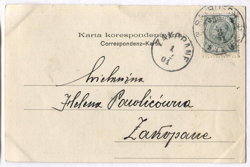 Bez danych wydawniczych. Reprodukcja obrazu sygnowanego monogramem J. K. Z korespondencją i znaczkiem. Data stempla: 1 VIII (?) 1901. Niewielkie zagięcia narożników; efekt przechowywania w albumie, poza tym stan dobry.
