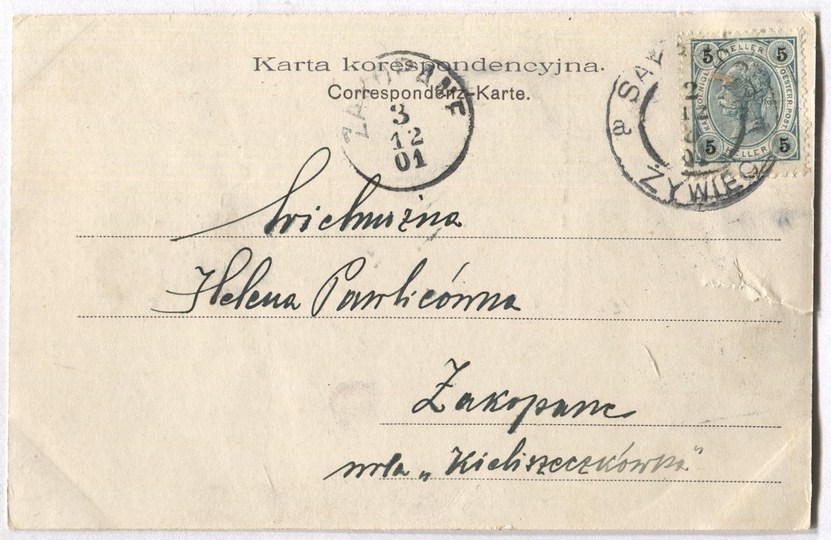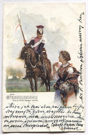 Bez danych wydawniczych. Reprodukcja obrazu sygnowanego monogramem J. K. Z korespondencją i znaczkiem. Data stempla: 3 XII 1901. Niewielkie zagięcia narożników; efekt przechowywania pocztówki w albumie, naddarcie dolnej krawędzi.