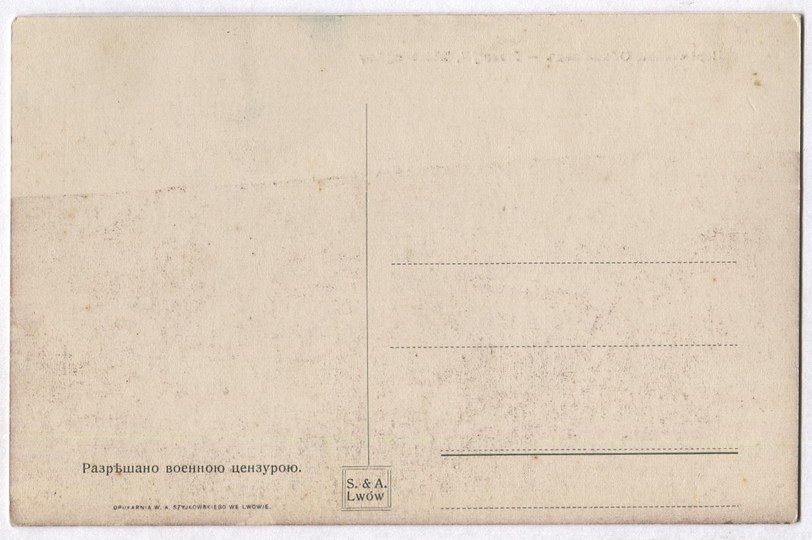 S. & A., Lwów. Drukarnia W. A. Szyjkowskiego we Lwowie. Razrešeno voennoju cenzuroju [cyrylicą]. Lata I wojny. Bez korespondencji i znaczka. Niewielkie otarcia na odwrocie.