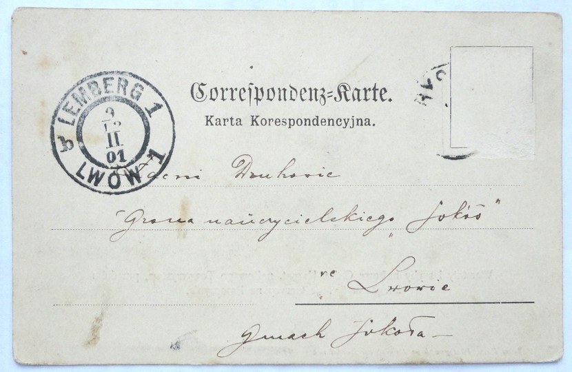 Wilhelm Russ, Photograph in Drohobycz. Pocztówka z długą linią adresową. Z korespondencją i dwoma stemplami pocztowymi. Znaczek usunięty. Miejscowe zaplamienia, poza tym stan dobry.
