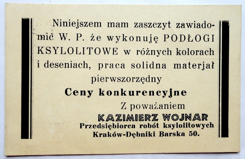[REKLAMA]. Niniejszem mam zaszczyt zawiadomić W. P. że wykonuję PODŁOGI KSYLOLITOWE w różnych kolorach [...] Kazimierz Wojnar Przedsiębiorca robót ksylolitowych Kraków-Dębniki Barska 50.
